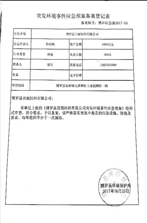 附件鏈接:《博羅縣百麗紡織有限公司突發(fā)環(huán)境事件應(yīng)急預(yù)案備案登記表》