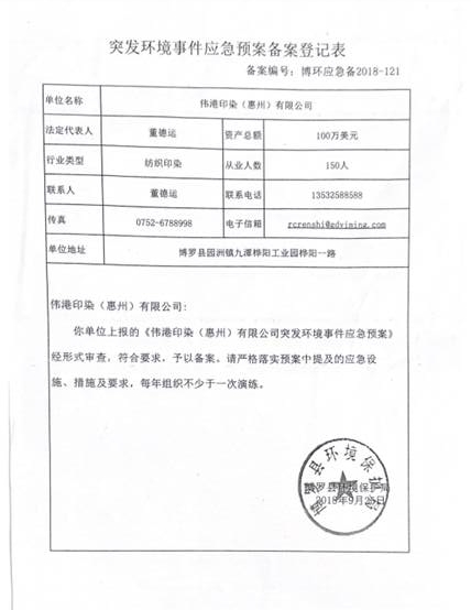 突發(fā)環(huán)境事件應(yīng)急預(yù)案    已制訂《偉港印染(惠州)有限公司突發(fā)環(huán)境事件應(yīng)急預(yù)案》,并于2024年 5月22日在博羅縣環(huán)境保護(hù)局備案,