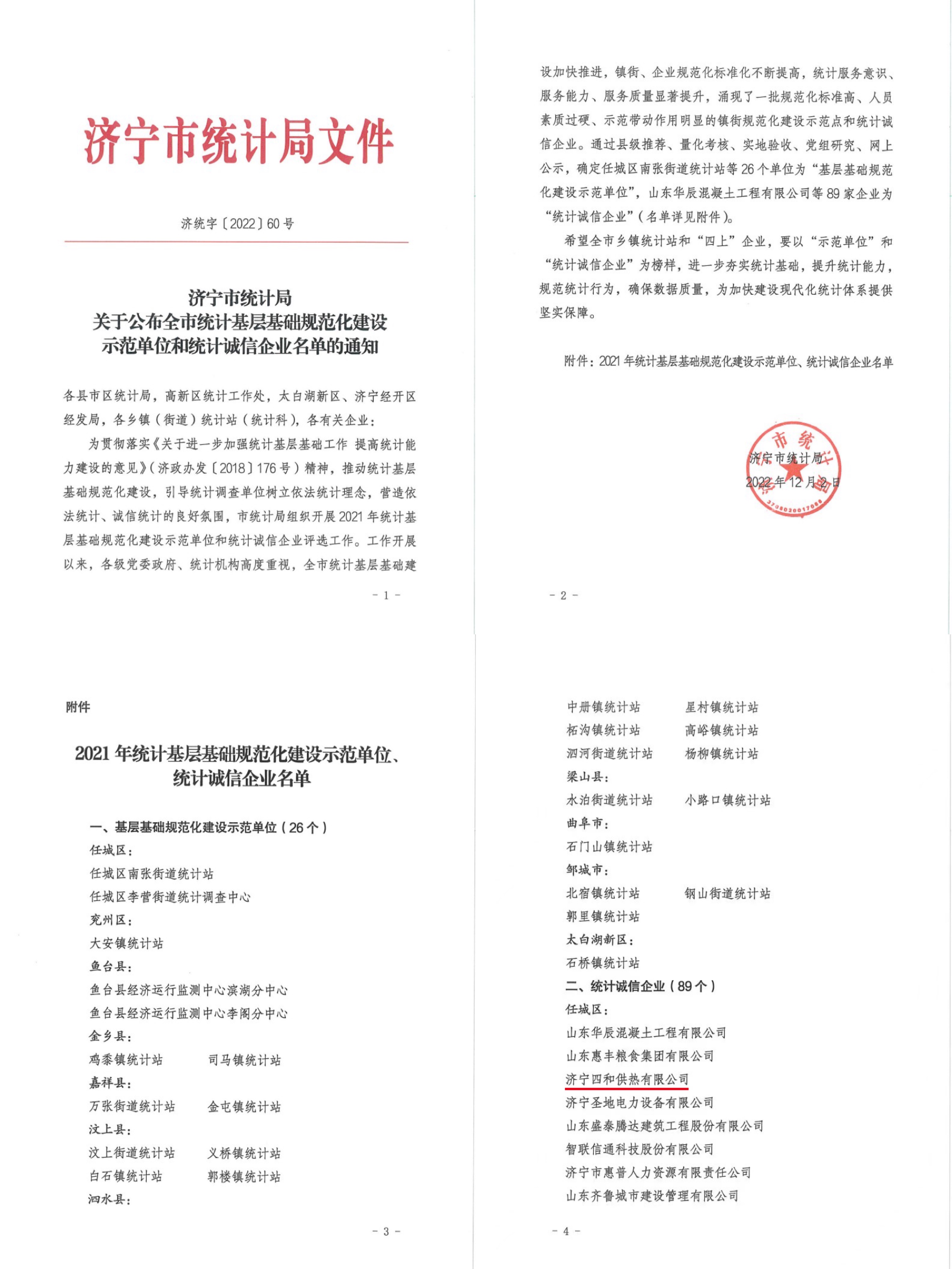 濟(jì)寧四和供熱有限公司 榮獲2021年統(tǒng)計(jì)誠信企業(yè)稱號(hào)