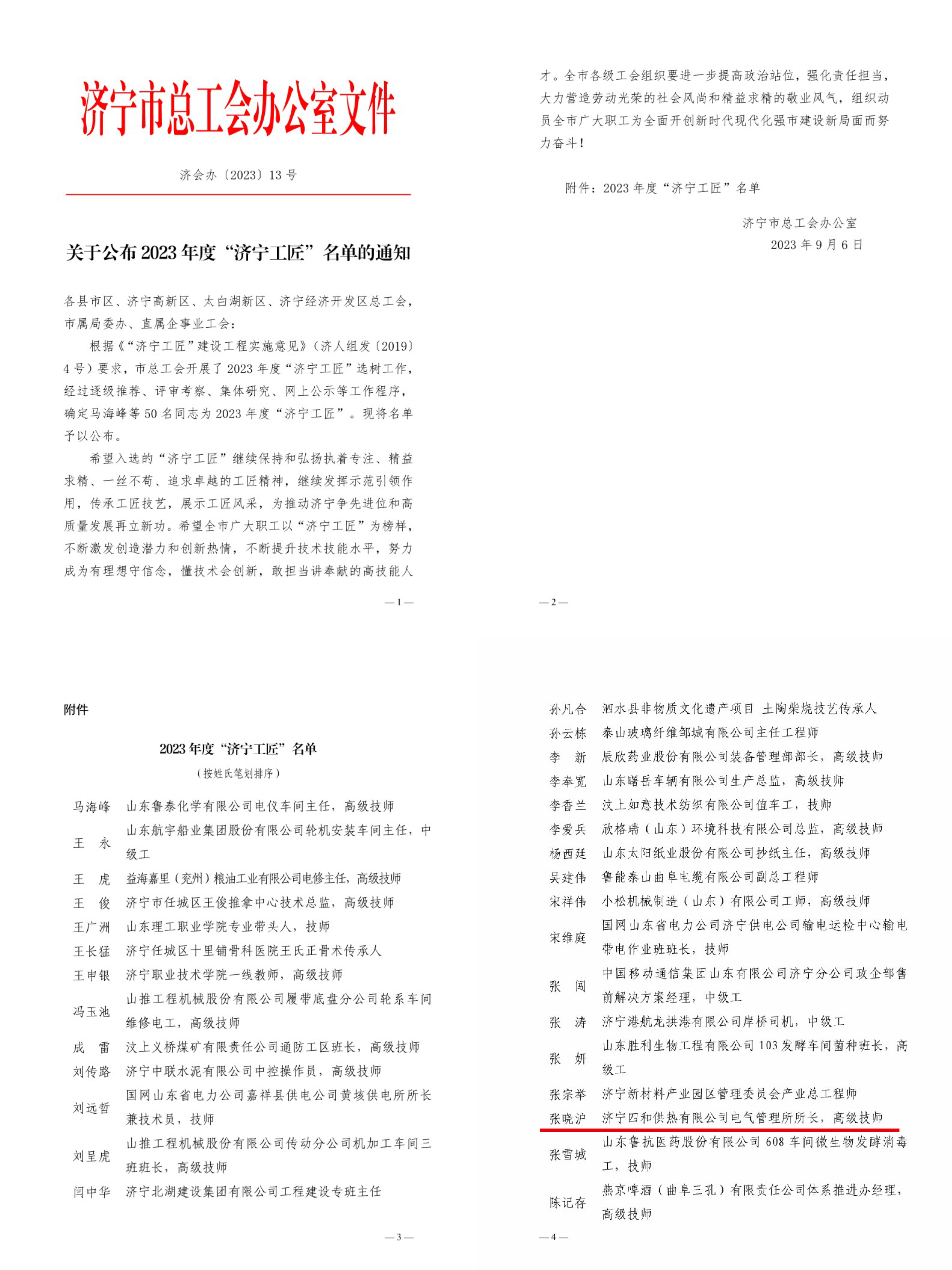 9月6日,濟(jì)寧市總工會辦公室印發(fā)了《關(guān)于公布2023年度“濟(jì)寧工匠”名單的通知》,濟(jì)寧四和供熱有限公司張曉滬同志名列其中,榮獲2023年度“濟(jì)寧工匠”榮譽稱號。