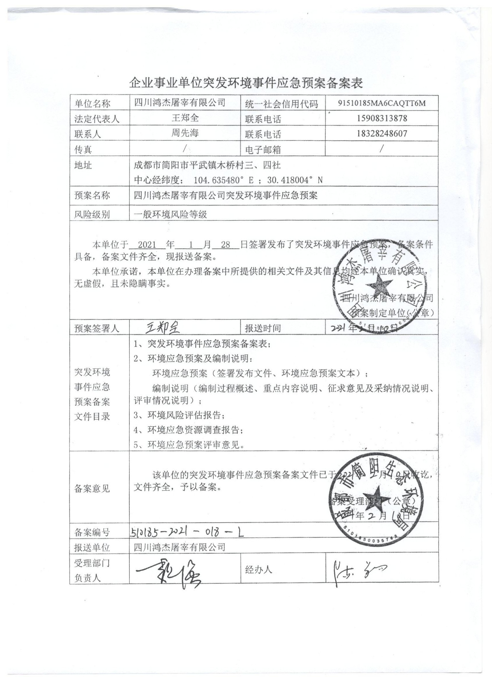 2、附件鏈接: 《四川鴻杰屠宰有限公司突發(fā)環(huán)境事件應(yīng)急預(yù)案備案表》電子版(點擊打開);